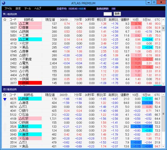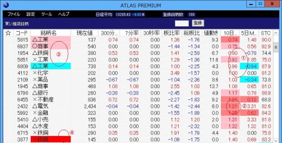 ATLASプレミアムでは、10日移動平均と5日日移動平均とMACDおよびストキャスティクスが上抜けまたは下抜けるすると上図@からCのようにリストに色付けされて表示されます。