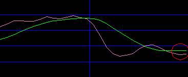 | 右のMACDのチャートのように、MACDラインが陽転(下向きから上向きに転換)すると、このような銘柄名のバックカラーがピンク色で表示されます(上図B)。 MACD陽陰転では、MACDラインとシグナルラインの交差よりもより早いタイミングでシグナルが表示されます。 |