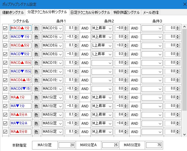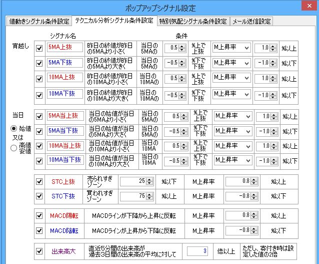 日足テクニカル分析によるポップアップシグナルは、移動平均用とMACD用とストキャスティクス用があり、それぞれ上昇率(一定時間当たりの株価の上昇・下落率)と組み合わせた条件で指定します。上昇率と組み合わせるのは、移動平均付近で上下するような値動きでは頻繁にシグナルが発生するので、強い上昇を伴って上抜けするような動きのときにポップアップシグナルを出すためです。移動平均線抜けのポップアップシグナルでは、シグナルを出すとき株価が何%以上上昇しているか(何%以下下落したか)、また、移動平均線の何%上で上抜けしたか(何%下で下抜けしたか)というように条件を細かく設定できます。移動平均用シグナルは、さらに宵越しと当日を個別に設定でき、MACD用シグナルでは、MACD陽転・陰転を個別に設定できます。