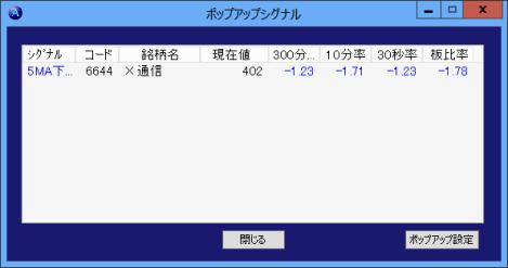 これらのリストに色付けして表示されるシグナルは、当日に上抜けまたは下抜けした後その抜けている状態が続く限り常時表示されます。また、ザラ場が終了した後に起動しても表示されます。次のポップアップシグナルは抜けた瞬間にリアルタイムにポップアップウィンドウに表示されるという違いがあります。