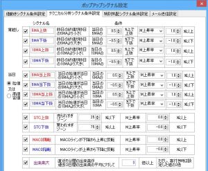 テクニカル分析によるポップアップシグナルは、移動平均用とMACD用とストキャスティクス用があり、それぞれ上昇率(一定時間当たりの株価の上昇・下落率)と組み合わせた条件で指定します。上昇率と組み合わせるのは、移動平均付近で上下するような値動きでは頻繁にシグナルが発生するので、強い上昇を伴って上抜けするような動きのときにポップアップシグナルを出すためです。移動平均線抜けのポップアップシグナルでは、シグナルを出すとき株価が何%以上上昇しているか(何%以下下落したか)、また、移動平均線の何%上で上抜けしたか(何%下で下抜けしたか)というように条件を細かく設定できます。移動平均用シグナルは、さらに宵越しと当日を個別に設定でき、MACD用シグナルでは、MACD陽転・陰転とMACD上抜け・下抜けを個別に設定できます。